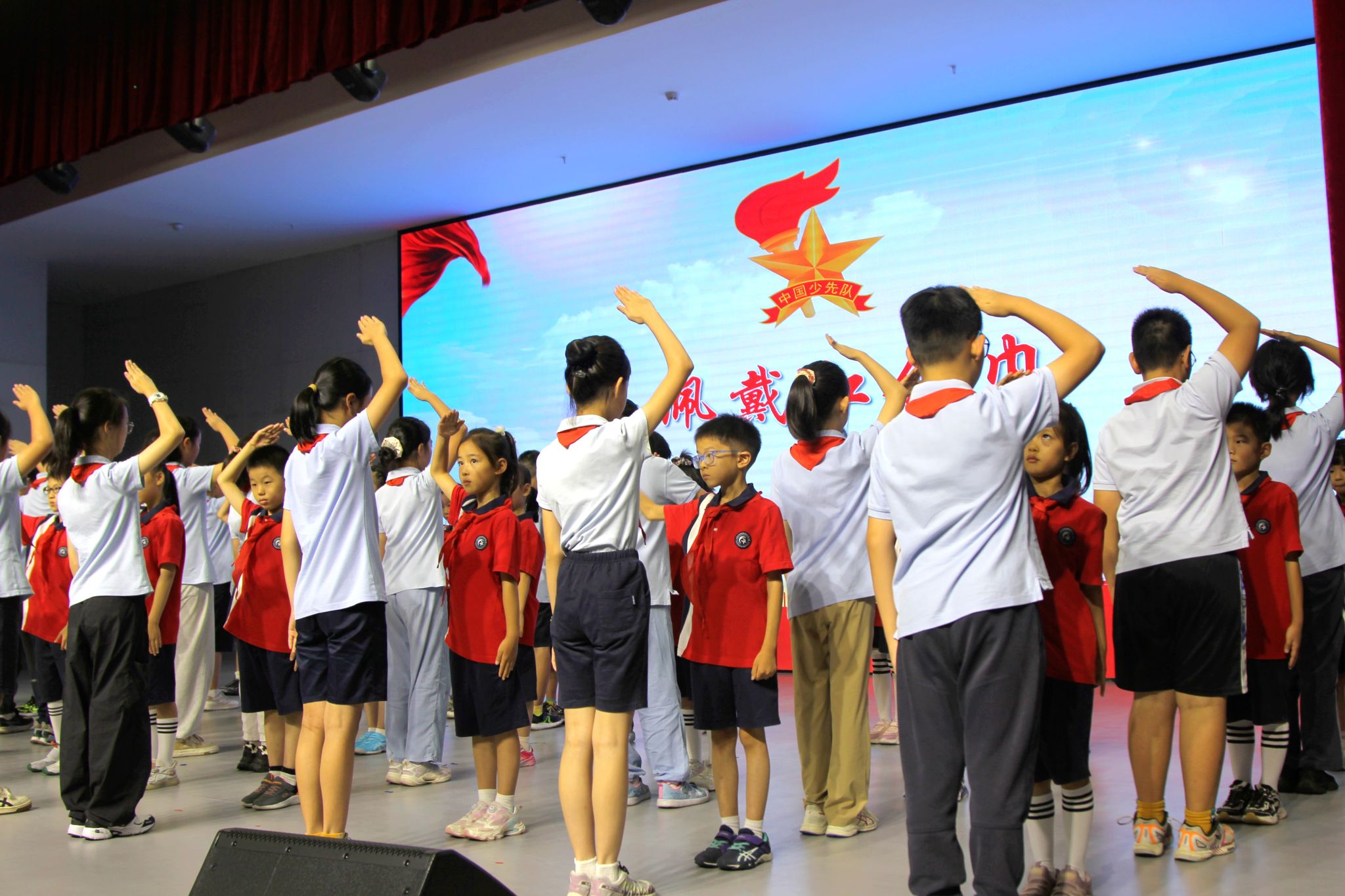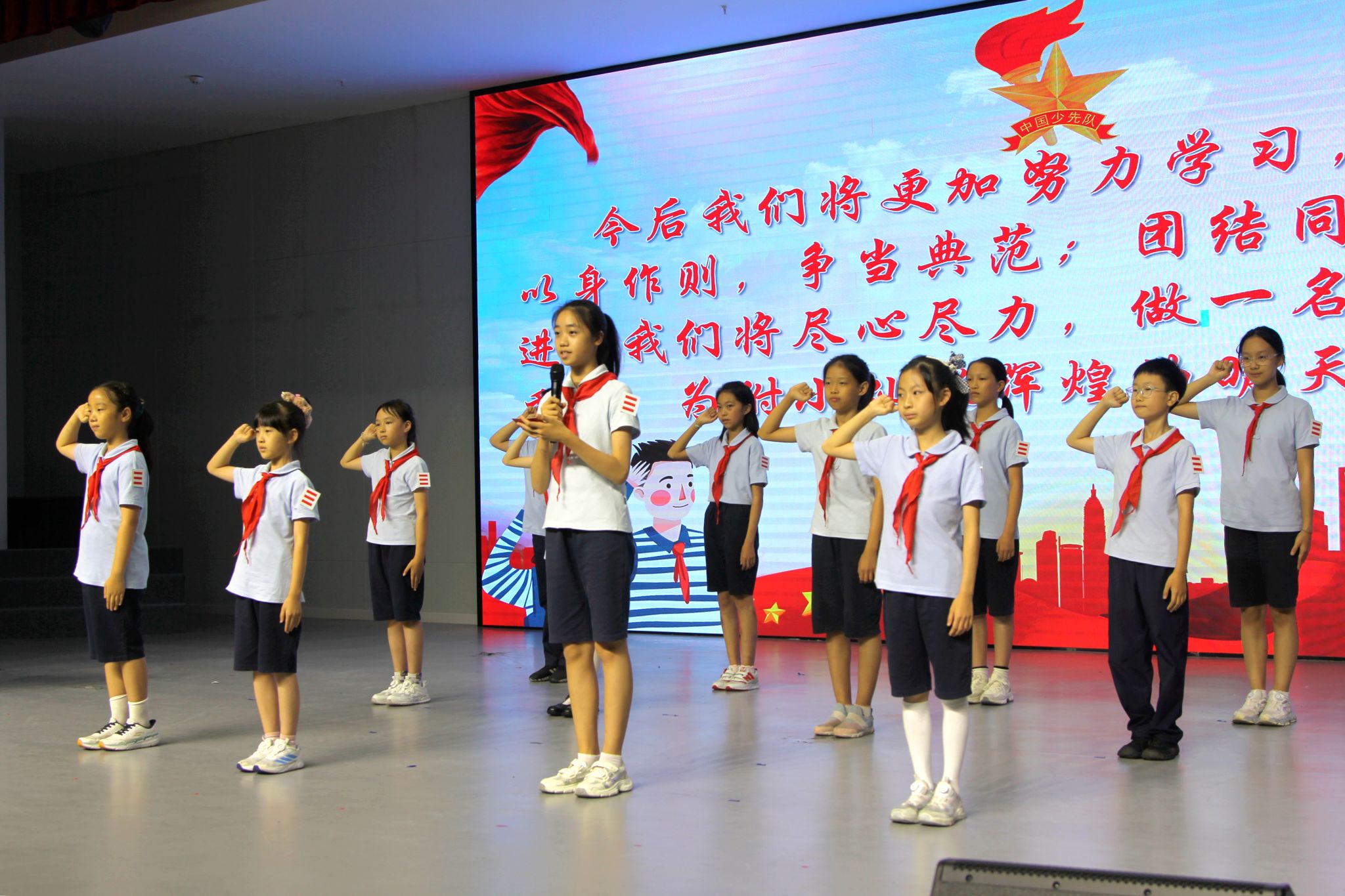 在鲜艳的队旗下,又一批同学光荣加入中国少年先锋队。六年级哥哥姐姐为他们佩戴上鲜艳的红领巾。全体新队员在队旗下庄严宣誓:好好学习,好好锻炼,准备着:为共产主义事业贡献力量!